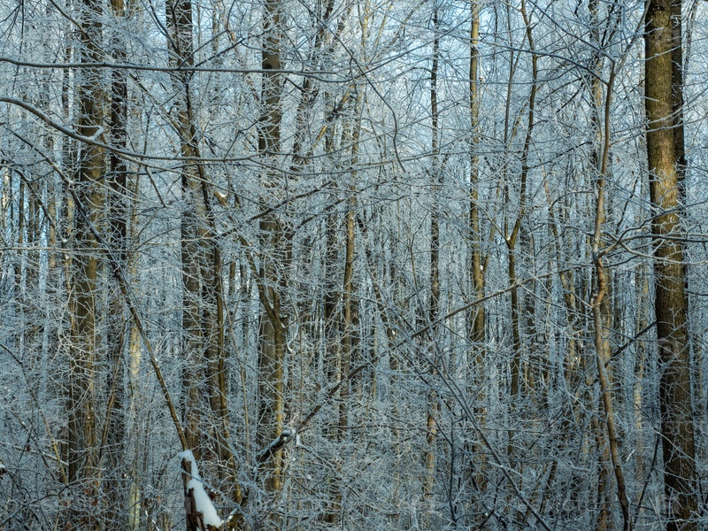 Зимний лес, покрытый инеем на заднем плане