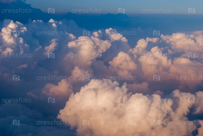 Вид сверху на облака и голубое небо из окна самолета, фон природы