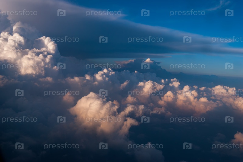 Вид сверху на облака и голубое небо из окна самолета, фон природы