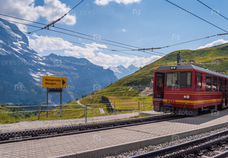Поезд на вокзале Кляйне Шайдегг в Бернском Оберланде, регион Швейцарии, на высоте 6762 фута. Кляйне Шайдегг, Швейцария, июль 2018 г