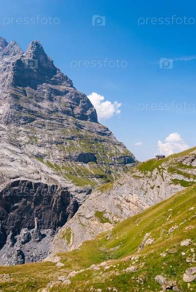 Отличный вид на горный хостел Berghaus Baregg, расположенный на склонах Шрекхорна.Швейцарские Альпы