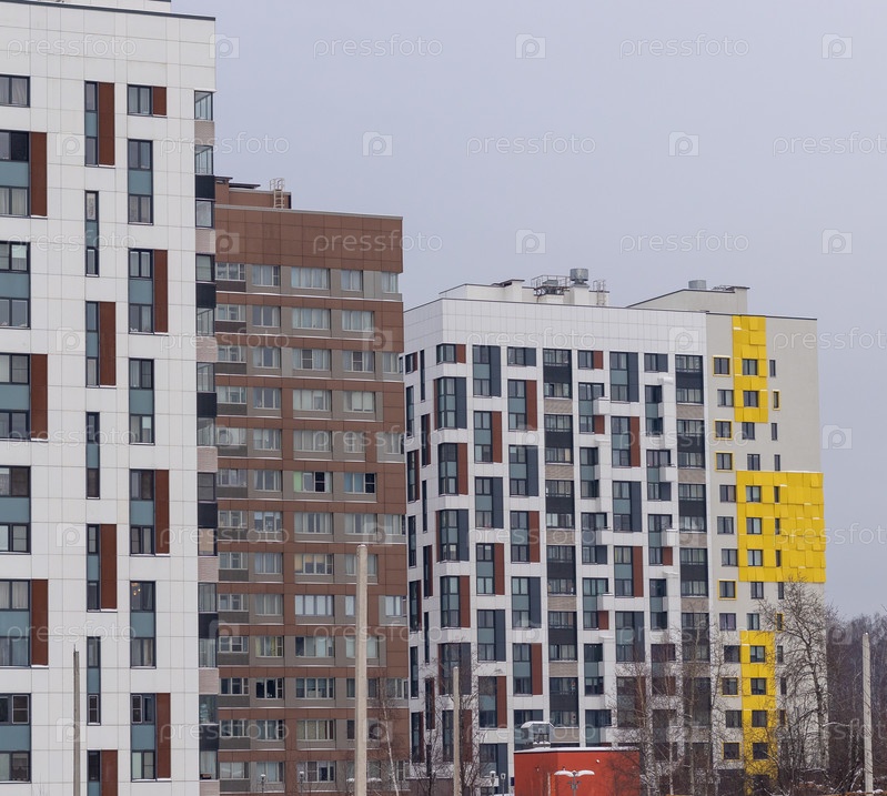 Современный многоквартирный дом с красочными фасадами на окраине города. Москва, Россия
