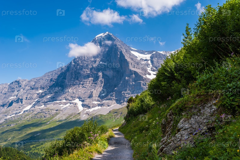 Походная тропа на фоне потрясающей альпийской панорамы северной стены пика Эйгер, Гриндельвальд, Бернские Альпы, Швейцария, Европа