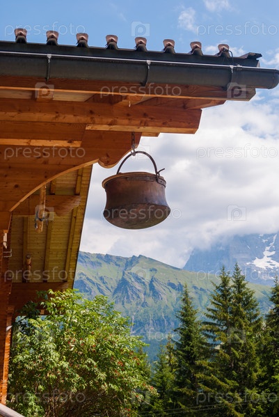 Традиционный старый горшок, свисающий с крыши в горах Швейцарии