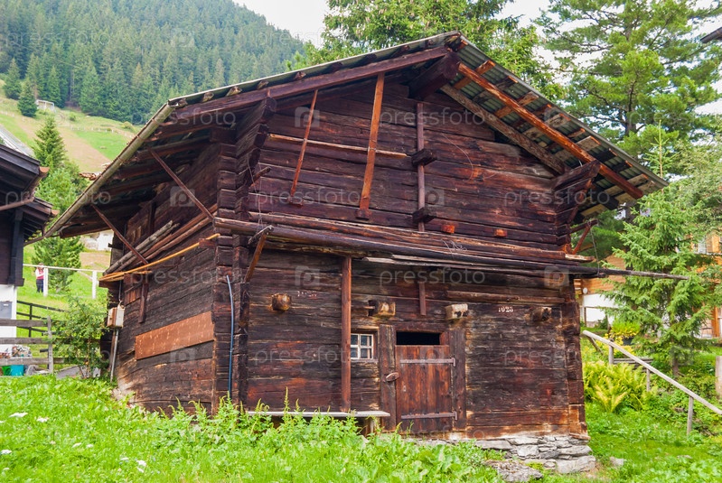 Небольшой старый деревянный сарай в окружении горного пейзажа в Швейцарии