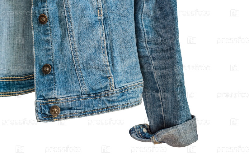 Нижняя часть синей джинсовой куртки. Фрагмент одежды на белом фоне