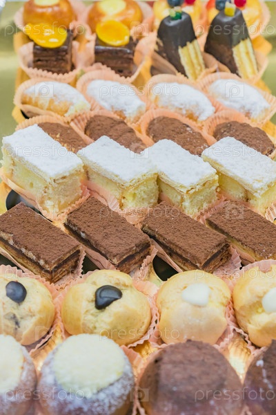 Витрина кондитерской с разнообразными мини-десертами и пирожными, моноблок, избирательный фокус