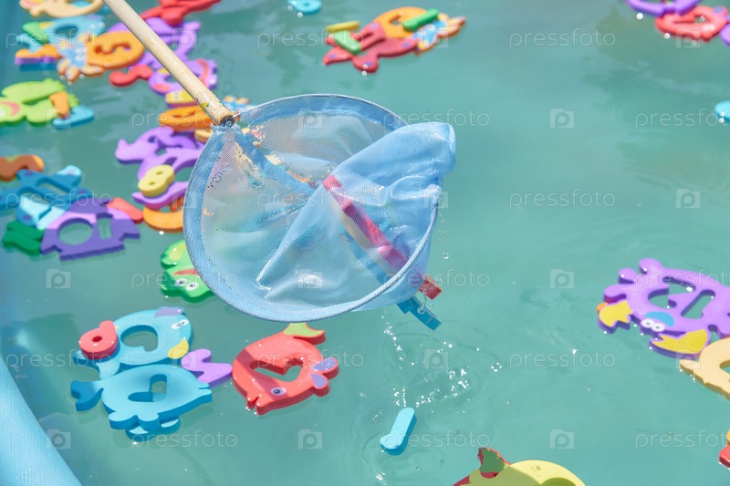 Крупный план плавающих красочных фигур морских животных в бассейне для ловли сетью. детские развлечения