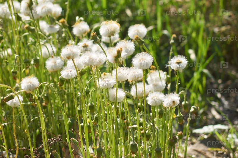 Цветущие белые пушистые цветы мать-и-мачехи на лугу