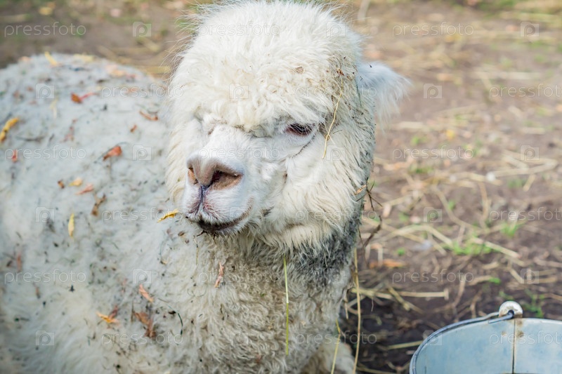 Портрет грязной белой альпаки на ферме