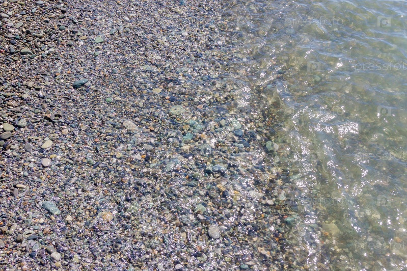 Галечная береговая линия. Морской берег с прозрачной водой и мелкими камнями