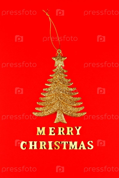 Праздничная открытка. Счастливого Рождества надписи на красном фоне с золотой блестящей елкой