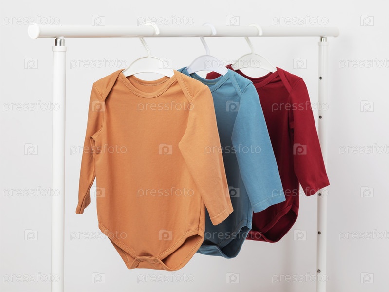 Разноцветные детские боди с длинными рукавами висят на вешалке