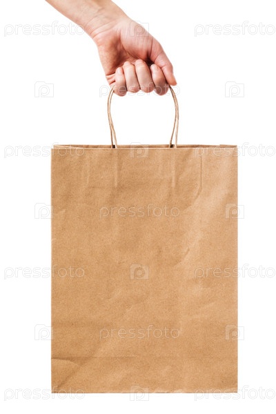 Мужчина держит в руке пакет бумаги, изолированный на белом фоне. Биоразлагаемый продукт