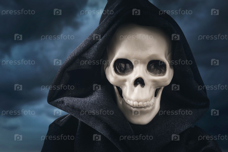 Крупный план человеческого скелета в капюшоне на фоне грозового неба