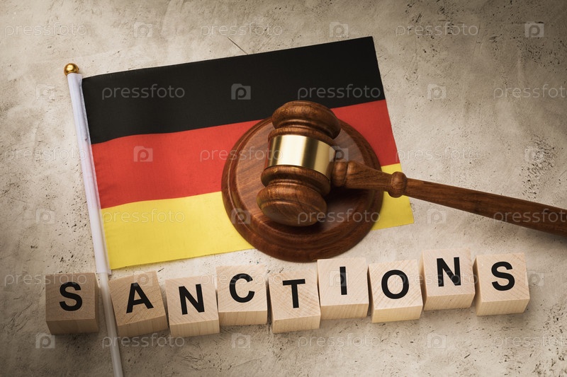 Немецкий флаг, молоток судьи и деревянные кубики с текстом, концепция на тему санкций в Германии