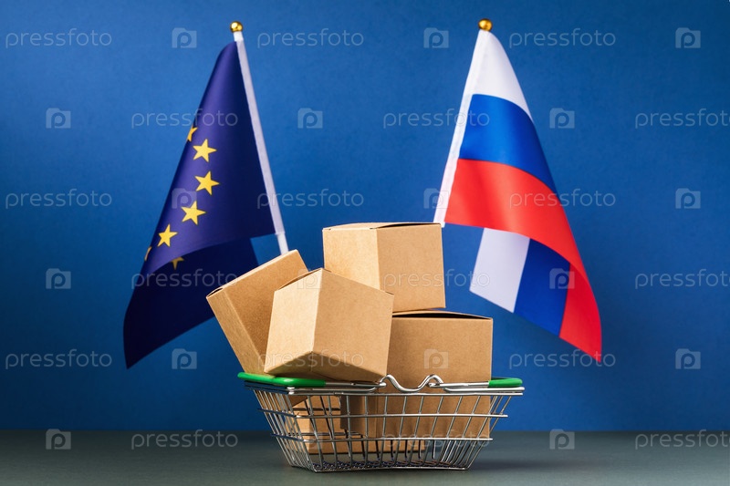 Различные коробки в продовольственной корзине и два флага на синем фоне, концепция торговли между Европейским союзом и Россией