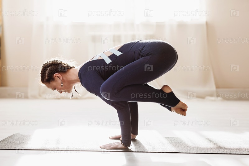 Красивая женщина, практикующая йогу, балансирующая стойка на руках, поза журавля, бакасана. Инструктор тренируется дома в синем комбинезоне у окна