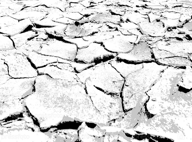 Текстура трещин. Структура сухой потрескавшейся почвы. Черно белая иллюстрация