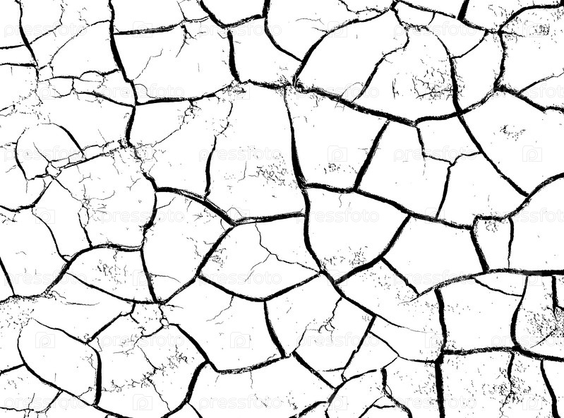 Текстура трещин. Структура сухой потрескавшейся почвы. Черно белая иллюстрация