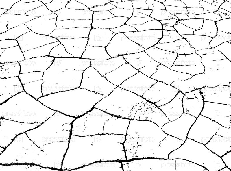 Текстура трещин. Структура сухой потрескавшейся почвы. Черно белая иллюстрация