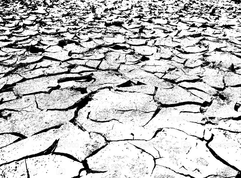 Текстура трещин. Структура сухой потрескавшейся почвы. Черно белая иллюстрация