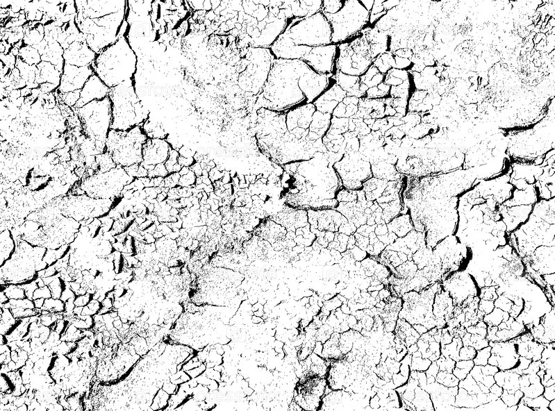 Текстура трещин. Структура сухой потрескавшейся почвы. Черно белая иллюстрация