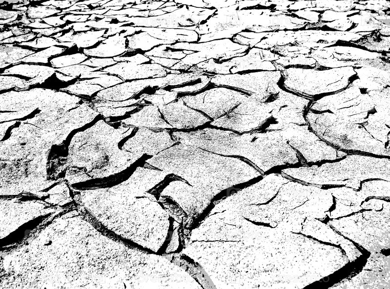 Текстура трещин. Структура сухой потрескавшейся почвы. Черно белая иллюстрация