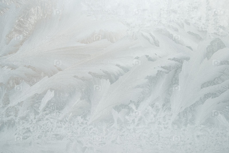 Зимние морозные узоры на замерзшем оконном стекле, светлый природный новогодний или рождественский фон