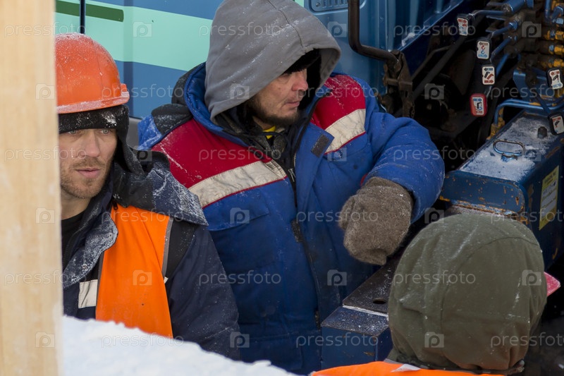 Трое рабочих говорят о гидравлическом подъемнике