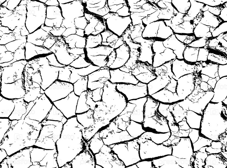 Текстура трещин. Структура сухой потрескавшейся почвы. Черно белая иллюстрация