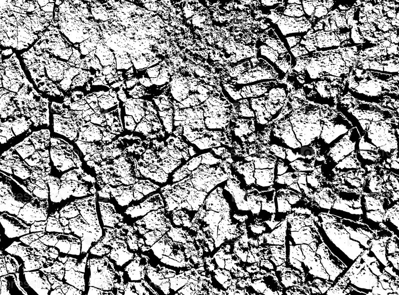 Текстура трещин. Структура сухой потрескавшейся почвы. Черно белая иллюстрация