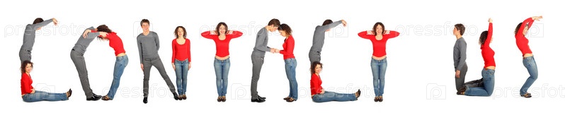 Молодой человек и девушка составляют фразу CONTACT US