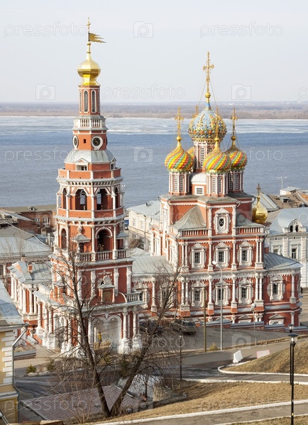 Рождественская церковь с мозаичными куполами. Вид в марте с набережной Федоровского. Нижний Новгород