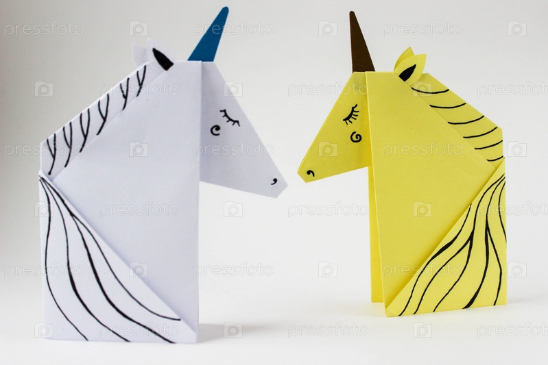 Белые и желтые единороги, выполненные в технике оригами на белом фоне