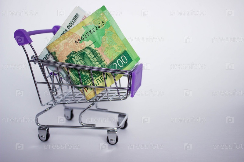Корзина с русскими деньгами. Банкноты двести одна тысяча рублей. На белом фоне с копией пространства