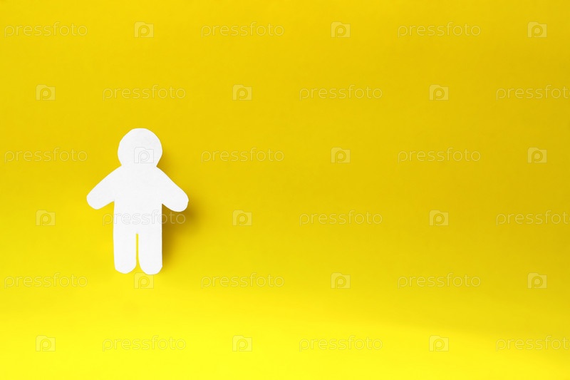 Силуэт человека из белой бумаги, вырезанной вручную. В левой части фото на желтом фоне. Человек, люди, концепция общества