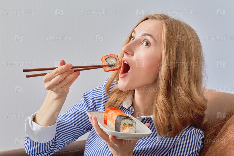 Женщина ест суши