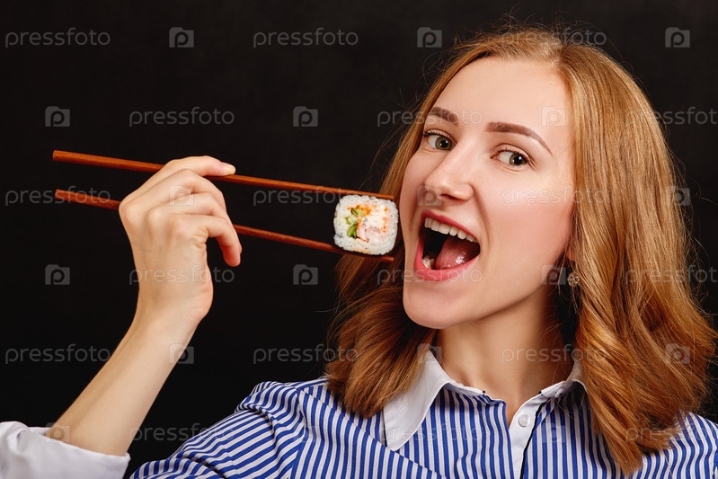 Женщина ест суши