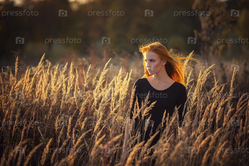 Серьезная женщина в сухой траве на закате