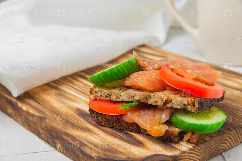 Сэндвич с красной рыбой с цельнозерновым хлебом, огурцом и помидорами на деревянной доске