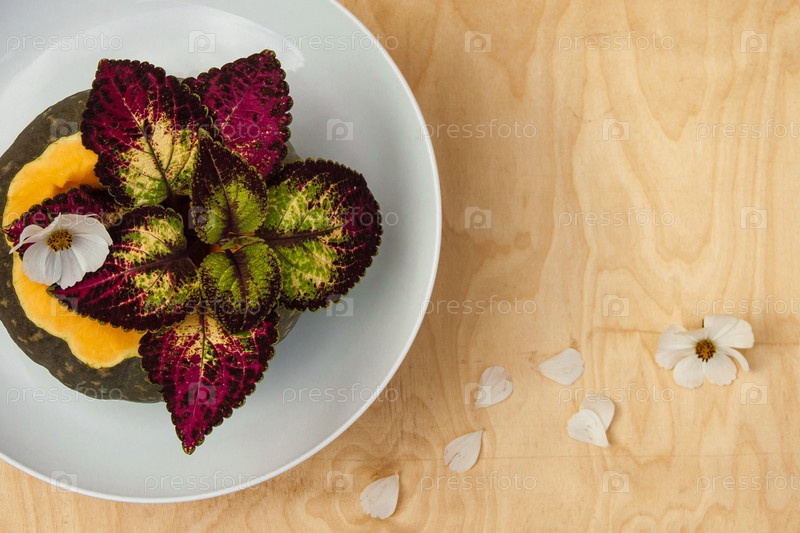 Цветочная композиция с тыквой, лежащей на белой тарелке на деревянном столе