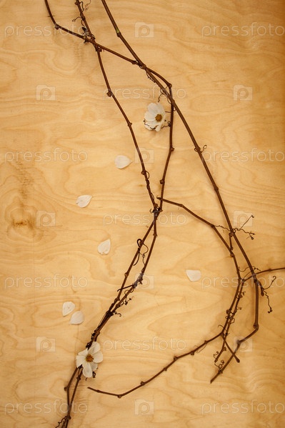 Белые цветы с виноградной лозой на деревянном фоне. Концепция проста