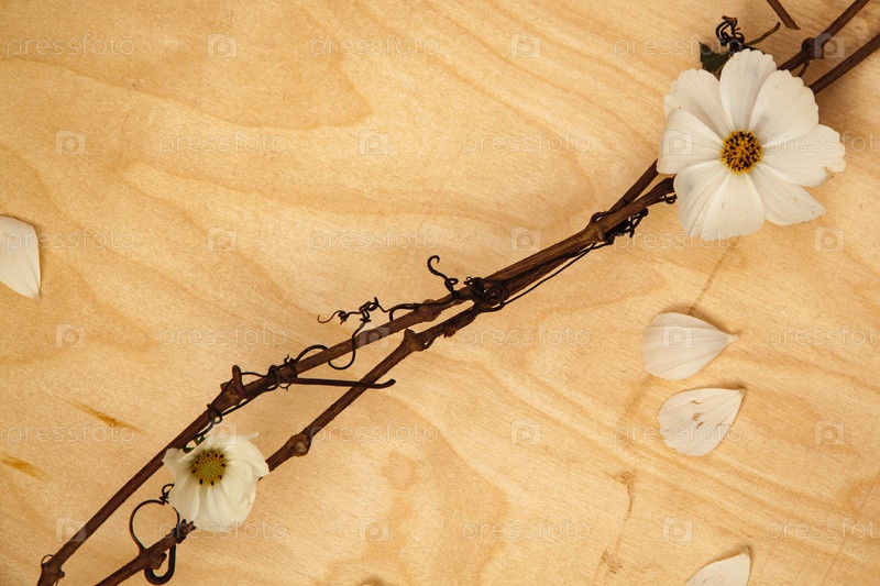 Белые цветы с темной лозой на деревянном фоне. Концепция проста