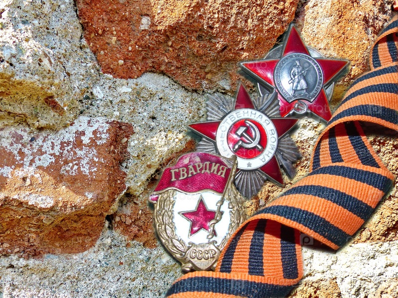 Ордена «Красной Звезды» и «Отечественной войны», знак «Гвардия» на георгиевской ленте. Награды фронтовика. Семейная реликвия. Память. 9 мая День Победы