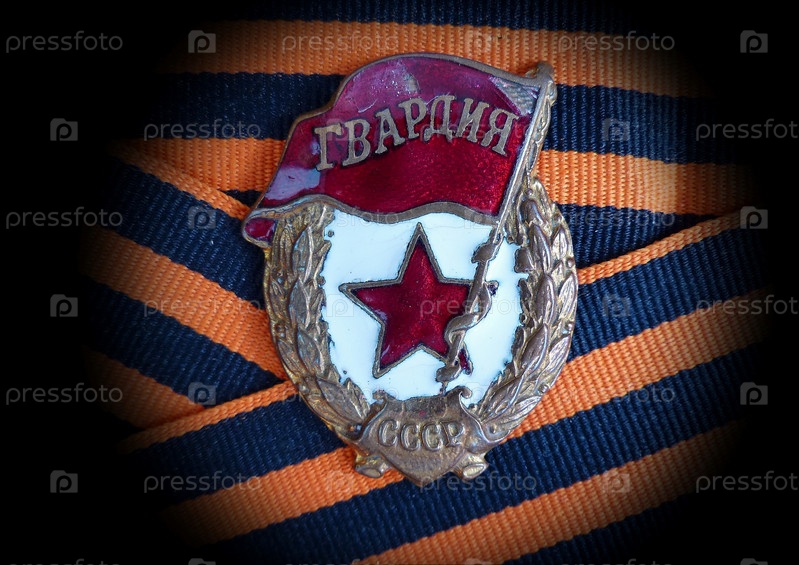 Знак «Гвардия» на фоне георгиевской ленты. Награда фронтовика. Реликвия. Память. 9 мая - День Победы