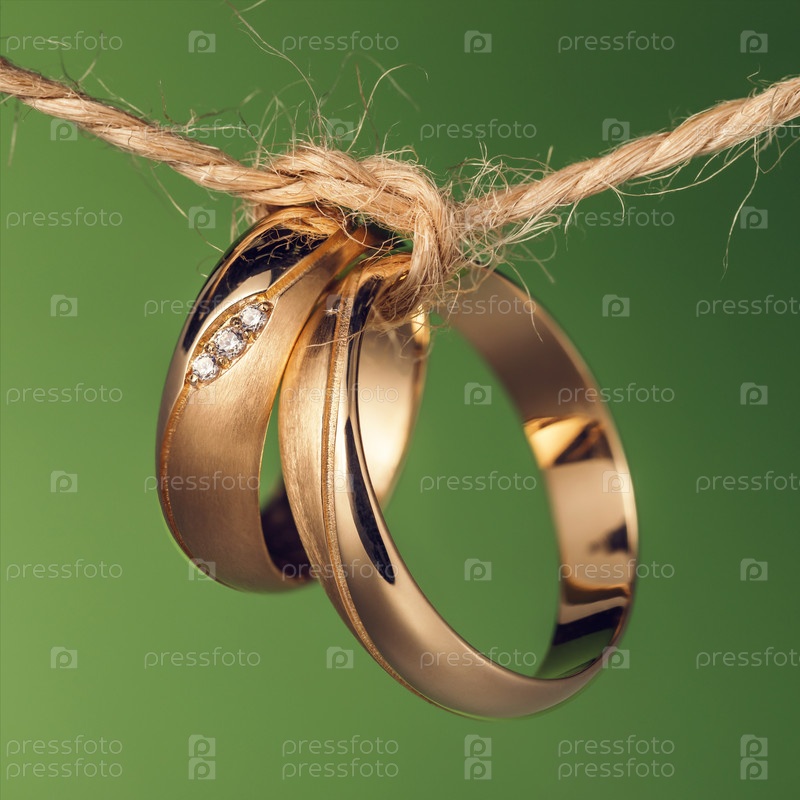 Два обручальных кольца, связанные веревкой на зеленом фоне