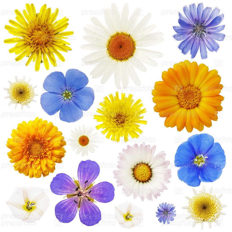 Большая коллекция полевых цветов, выделенных на белом фоне. Растения используются в различных лекарственных препаратах