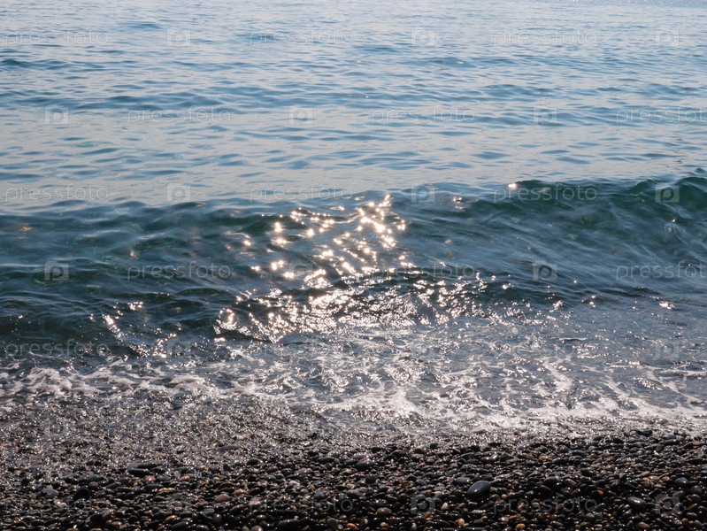 Чистая морская волна падает на галечный пляж в солнечный день