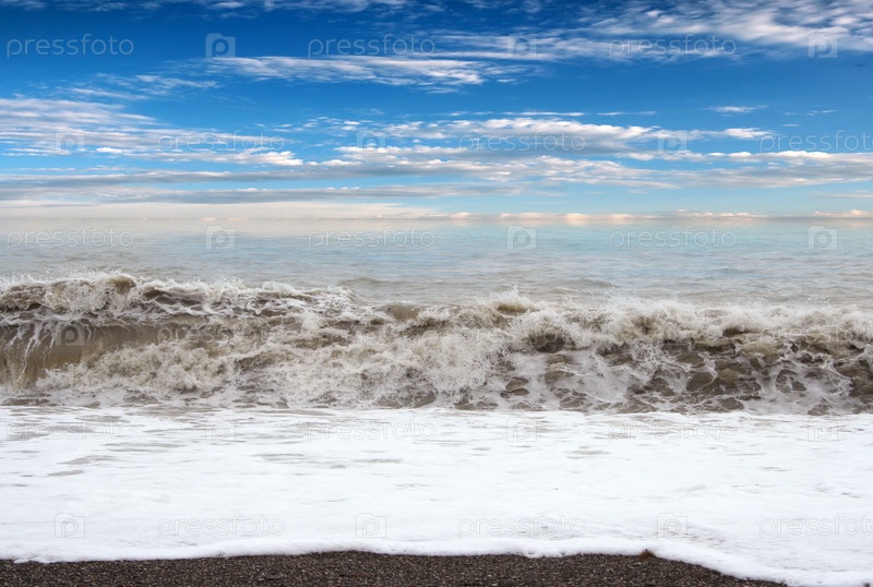 Штормовые волны и галечный пляж на берегу моря
